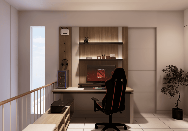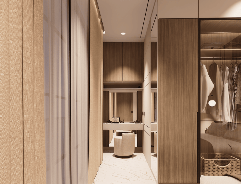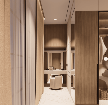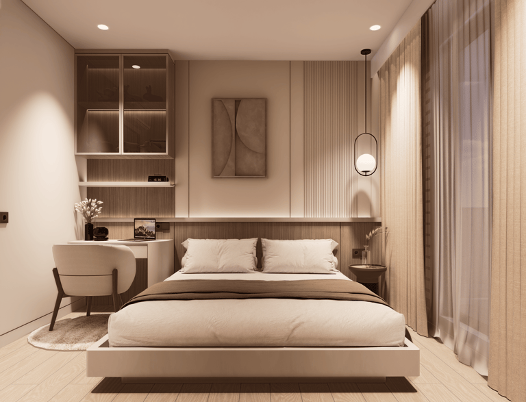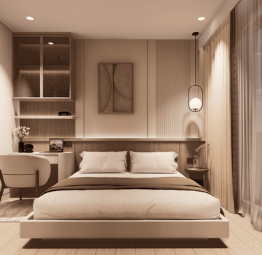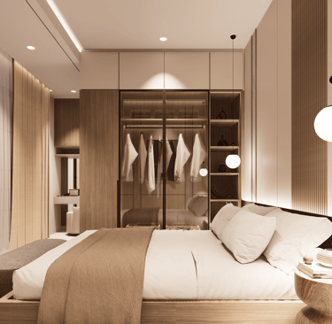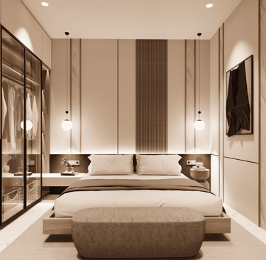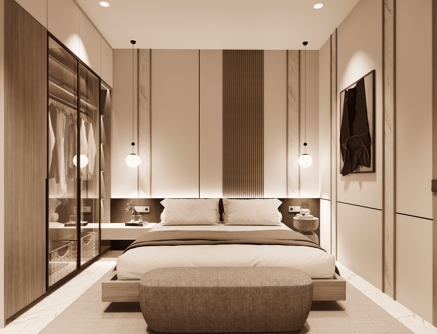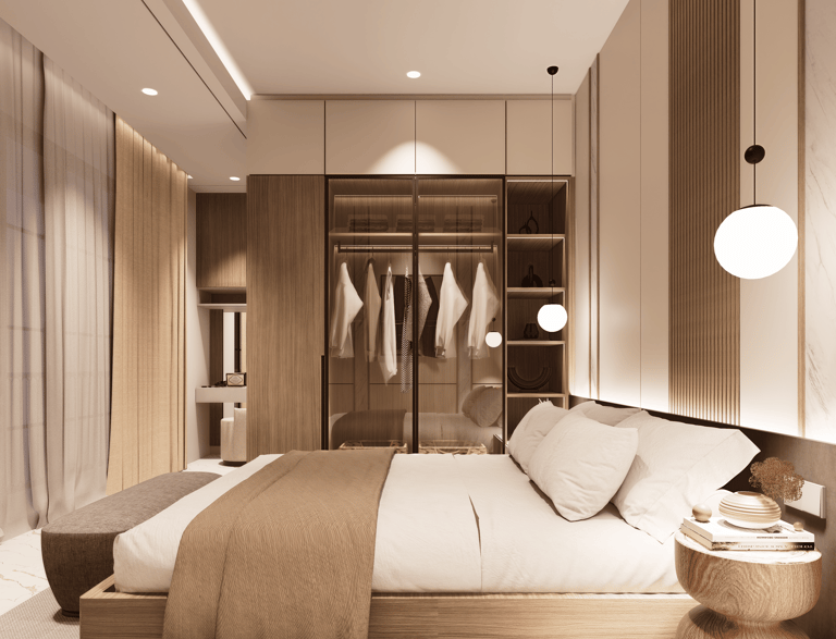 Master Bedroom dengan hanging lamp dan lemari pakaian luas.